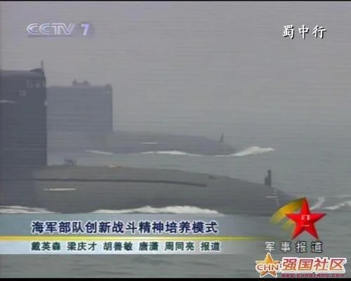 Tout aussi intéressante, cette image d’un reportage de CCTV, la télévision d’état. Le journaliste indique qu’il s’agit de 2 sous-marins nucléaires Type 091. Ils ne ressemblent pas à des Type 091. Un posteur nommé crobato sur le Sino Defence Forum ne le pense pas non plus. Certains bloggeurs chinois les appellent des Type 091 mod III, pendant que pour d’autres, il s’agit d’une première version du Type 093.