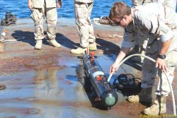 Les États-Unis sont venus à Toulon avec un exemplaire du REMUS. « Un genre de petite torpille que l’on programme pour aller reconnaître les zones en eaux très peu profondes, mais qui ne remplace pas encore complètement les plongeurs démineurs », explique le lieutenant de vaisseau Gipson, du Corps des Marines.