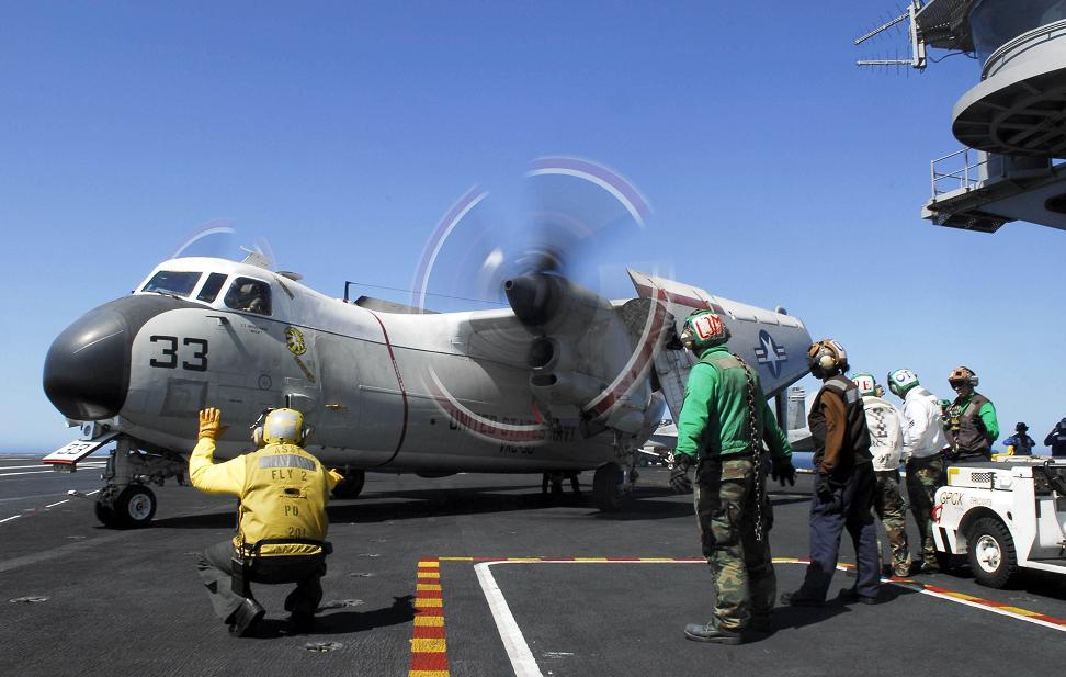 Sailors act as "prop safeties" as a C-2A Greyhound from the "Providers" of Fleet Logistics Support Squadron (VRC) 30 performs pre-flight checks on the flight deck of the Nimitz-class aircraft carrier USS John C. Stennis (CVN 74). © Josue L. Escobosa / US Navy
