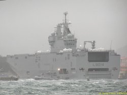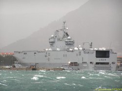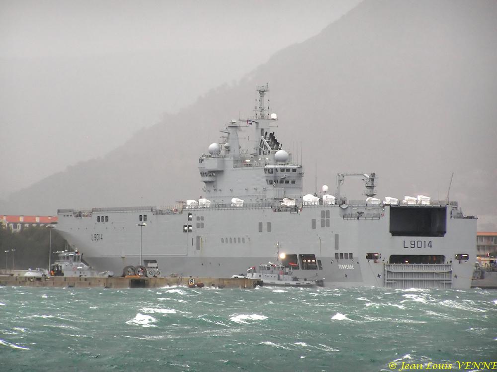 La surface exposée au vent d’un BPC se comporte comme une voile. A partir d’une certaine vitesse de vent, les aussières peuvent ne plus suffire à retenir le bâtiment. C’est la raison pour laquelle, ce dimanche, au plus fort de la tempête qui soufflait sur Toulon, on a pu voir 2 remorqueurs de la base navale venir épauler le Tonnerre et le maintenir à quai.