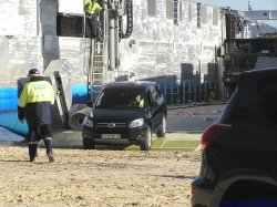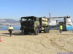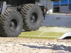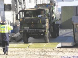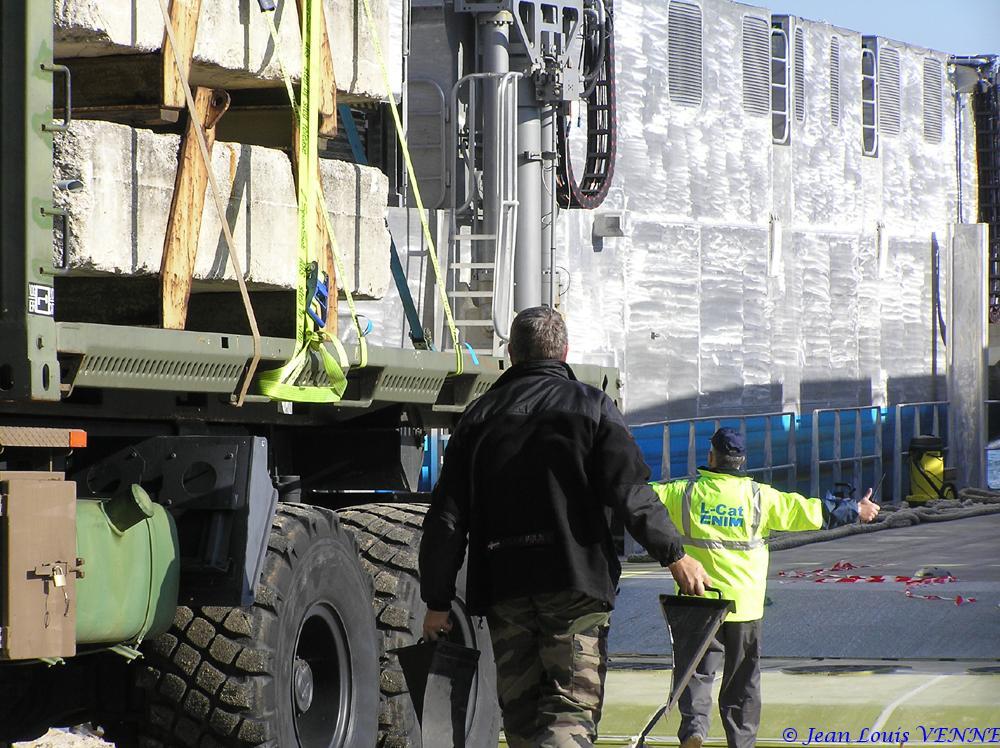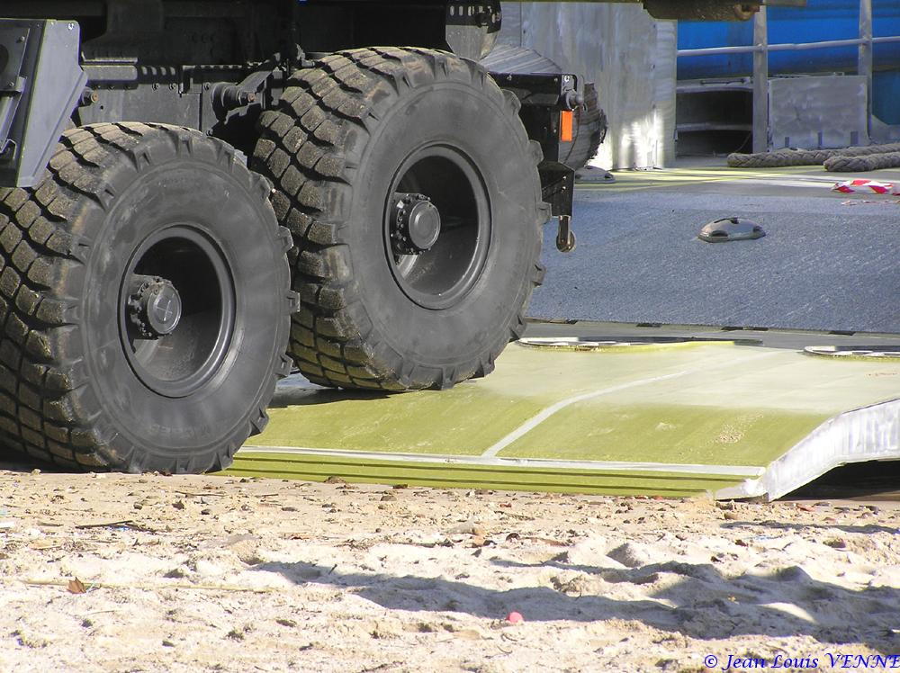 Pour la charge totale certifiée pour les premiers essais de plageage en charge, 26 tonnes pour le camion Trm 10000 avec les plots en béton, et 2 tonnes par 4x4. AU total, les essais ont donc été effectués avec 34 tonnes de fret. Les plageage et déplageage ont été uniquement effectués sur 2 moteurs de propulsion.