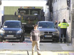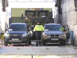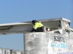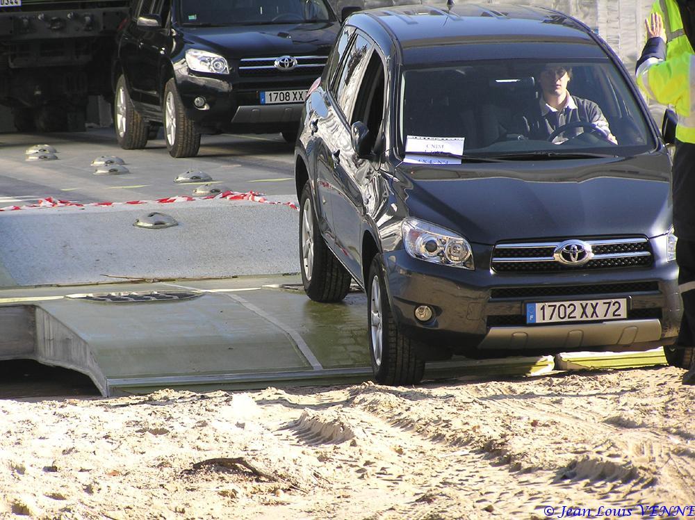Pour la charge totale certifiée pour les premiers essais de plageage en charge, 26 tonnes pour le camion Trm 10000 avec les plots en béton, et 2 tonnes par 4x4. AU total, les essais ont donc été effectués avec 34 tonnes de fret. Les plageage et déplageage ont été uniquement effectués sur 2 moteurs de propulsion.