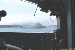 A la passerelle, l’amiral a répondu aux questions des journalistes au sujet de cet exercice. Mais il s’est aussi exprimé sur les futurs projets de la rade (dont la priorité était la réfection de la grande jetée), le retrait prochain de la Saône de son lieu d’amarrage, le projet de retirer les bâtiments devant l’école de plongée à Saint Mandrier, etc...