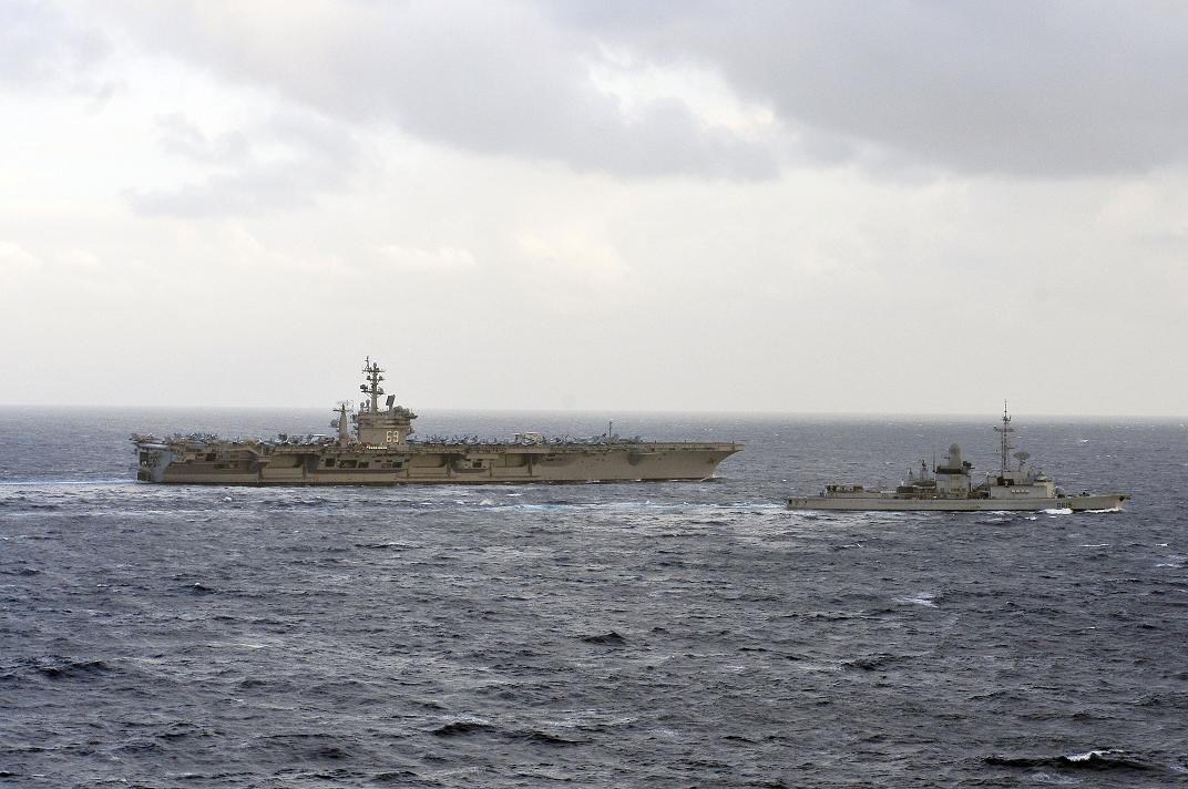 Le porte-avions USS Dwight D. Eisenhower (à gauche) et la frégate française Jean Bart (à droite) transitent en Méditerranée. Image prise le 12 mars. © Kenneth R. Hendrix / US Navy