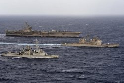 Le porte-avions USS Dwight D. Eisenhower (en haut), le croiseur lance-missile USS Vicksburg (au centre) et la frégate française Jean Bart (en bas) transitent en Méditerranée. Image prise le 12 mars. © Kenneth R. Hendrix / US Navy