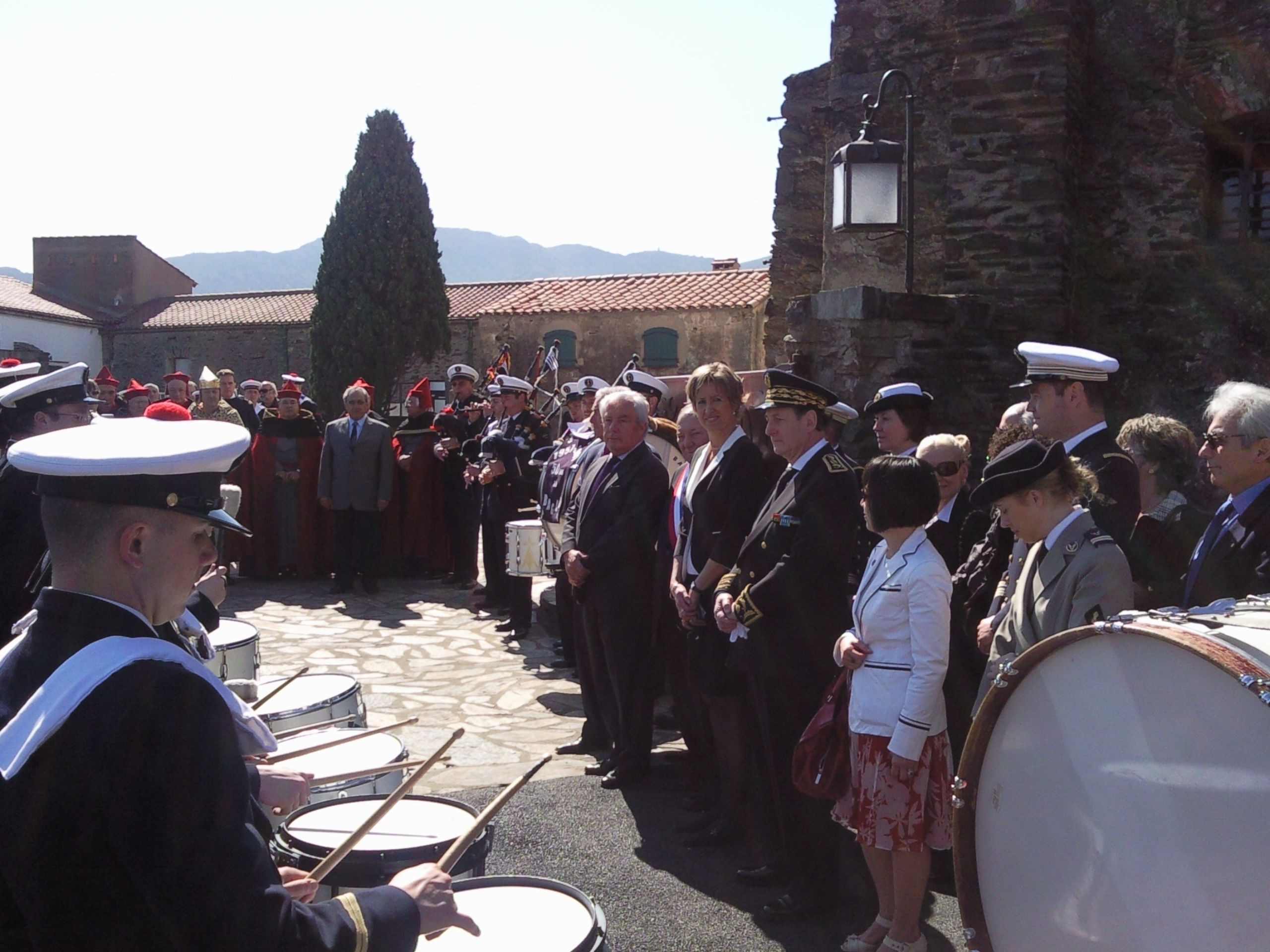 – Alain MARLEIX : secrétaire d’Etat à l’Intérieur et aux Collectivités territoriales (avec les cheveux blancs) – à sa gauche Jean Rede, Maire de Banyuls – à sa gauche Jacqueline Irles, Députée des Pyrénées Orientales – à sa gauche Hugues Bousiges, Préfet des Pyrénées Orientales – derrière Madame Irles, Capitaine de Corvette Christine Alain, commandant l’Aviso CDT Bouan – CF Henry Berling, commandant le flotille 31F.