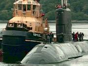 Le sous-marin lors de son remorquage jusqu’à la base de Faslane, en Écosse, après l’accident.