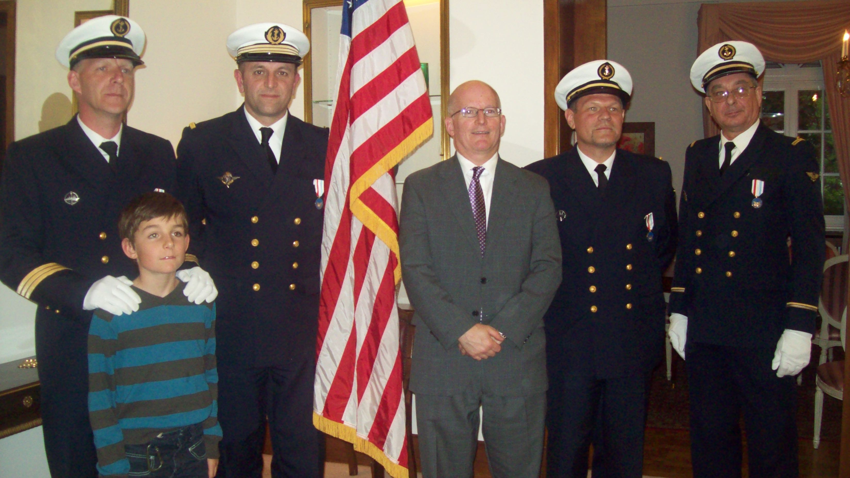 Alex Frézé, Jean-Louis Planty, Fabien Reymann et Christian Muller, tout quatre Haut-Rhinois et réservistes dans la marine nationale française, écoutent avec attention l’allocution du diplomate. Leurs familles à leurs côtés, ils vont tout à l’heure être décorés par le Consul Général qui ponctue maintenant son intervention : « La France et les USA sont souvent engagés côte à côte pour la défense des mêmes valeurs. Tout en préservant leurs autonomies respectives, ces deux Nations travaillent de concert aux mêmes objectifs, c’est la raison pour laquelle je suis heureux de vous recevoir aujourd’hui. »