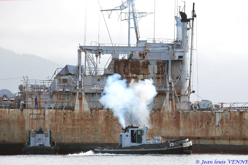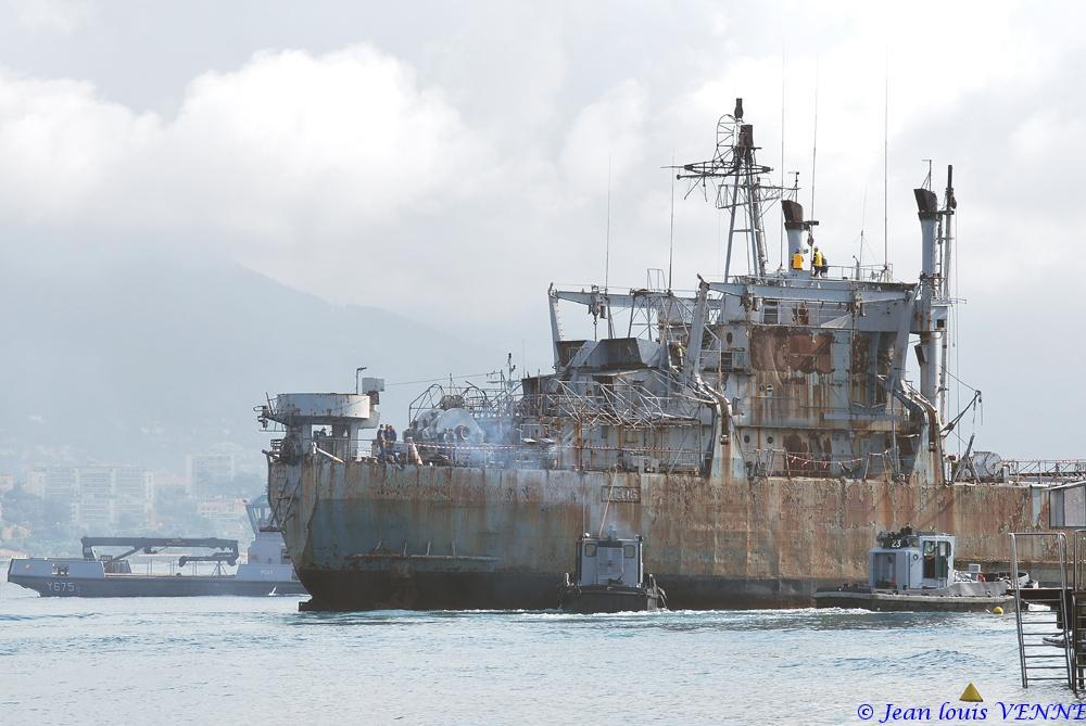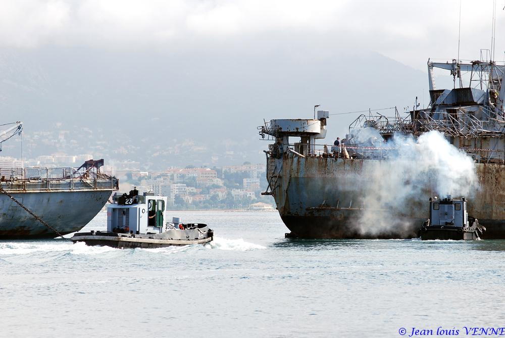 La coque de l’ex-Argens, un bâtiment de débarquement de chars construit en 1958 et désarmé en 1984, est arrivée ce mardi dans la base navale de Toulon.