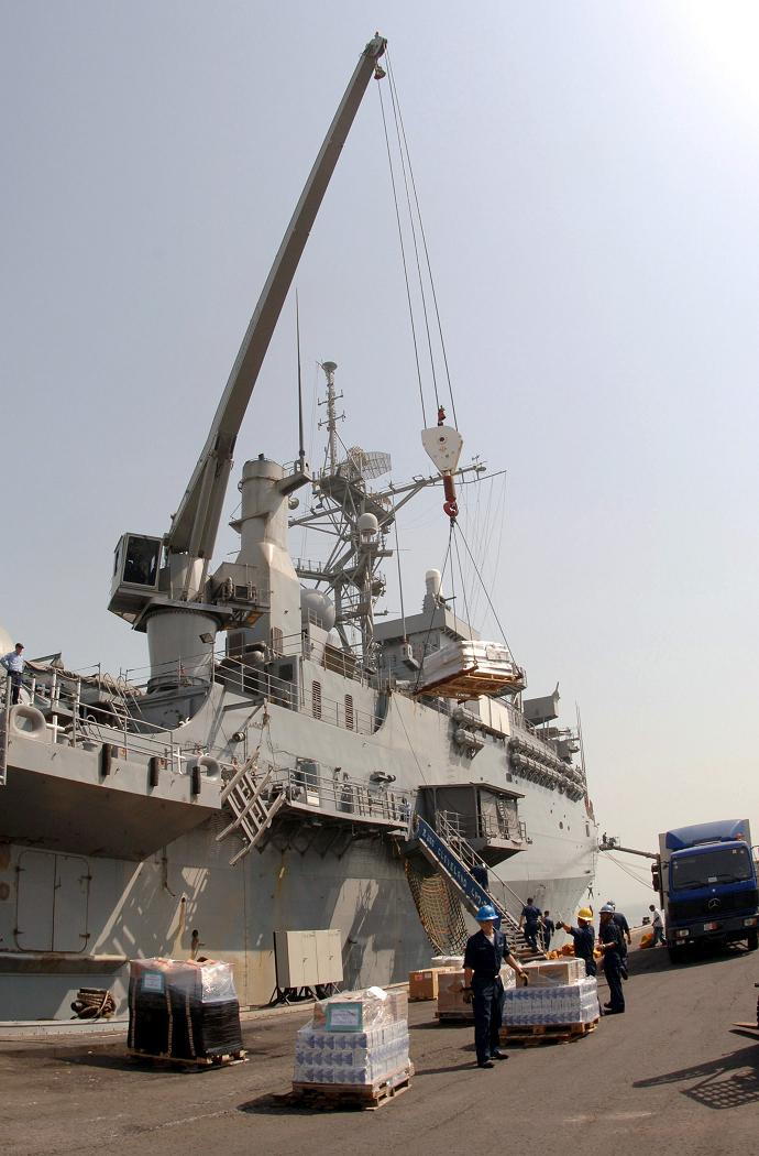 Le Cleveland, un navire de transport amphibie qui transporte habituellement des Marines et des véhicules de combat, attend de rassembler plus de nourrtures et d’autres matériels destinés au Pakistan pendant son escale à Bahreïn.