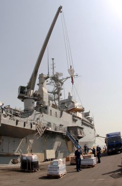 Des marins du pétrolier ravitailleur Var déchargent des pallettes de farine, de lait et de pain destinées aux victimes du tremblement de terre du Pakistan. La Marine Nationale a participé avec plus de 2 tonnes de nourriture aux efforts de sauvetage, après un tremblement de terre dévastateur, qui a tué des milliers de personnes au Pakistan. Photo U.S. Navy par Phillip Nickerson Jr.