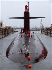 Sur le pont du dernier né de la Direction des constructions navales (DCN) de Cherbourg, le sous-marin nucléaire ’Le Vigilant’ dans son bassin d’achèvement à Cherbourg © AFP/Archives Jean-Paul Barbier