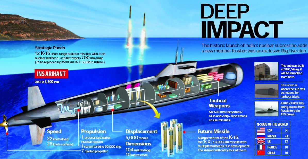 L’INS Arihant est plus long que tout autre sous-marin actuellement en service dans la foltte indienne. Un sous-marin nucléaire est alimenté par un réacteur nucléaire, qui génère une chaleur importante alimentant une turbine à vapeur. Son endurance en plongée est illimitée et sa vitesse est le double de celle de ses homologues à propulsion classique.