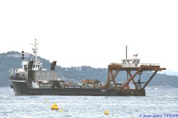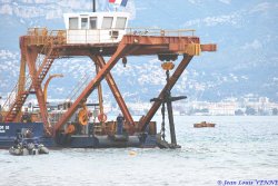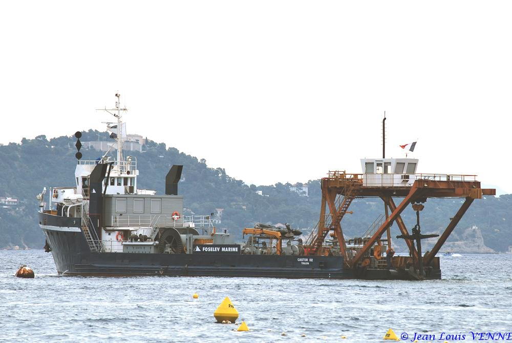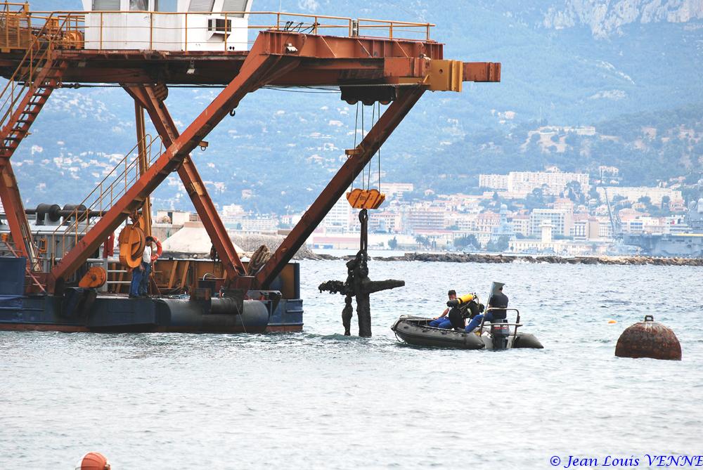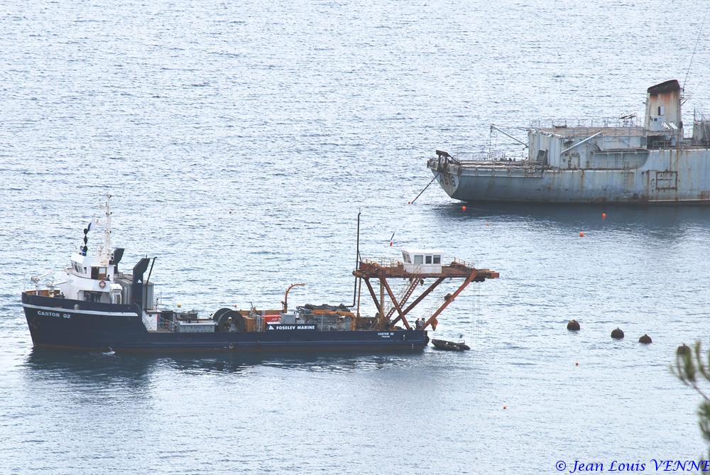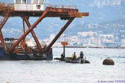 Le 22 juillet dernier, le navire Castor 02 s’est installé devant l’école de plongée de la marine nationale à St Mandrier pour relever des ancres et chaînes posées sur le fond, qui avaient servi pour l’embossage de la Rance et du Cdt Rivière.