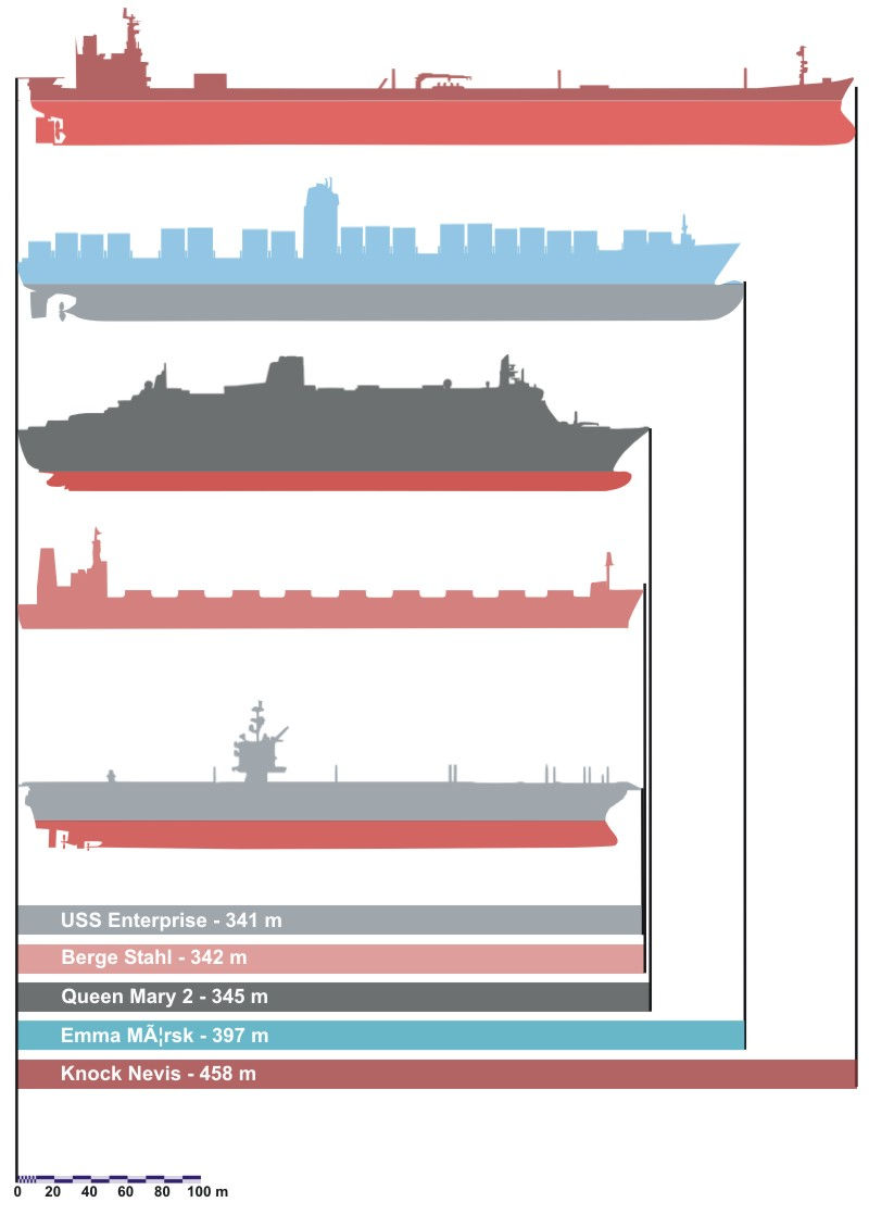 Indubitablement, les porte-avions nucléaires américains de la classe Enterprise sont énormes, gigantesques... Mais, contrairement à ce qu’on pourrait penser, ce ne sont pas, et de loin, les plus gros navires naviguant actuellement. En fait, un certain nombre de paquebots, de pétroliers et de porte-conteneurs sont encore plus gigantesques qu’eux.
