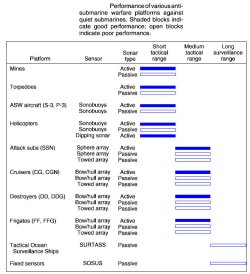 Dans l’illustration ci-dessous, nous pouvons voir les principaux senseurs acoustiques de l’US Navy et leur efficacité contre les sous-marins non-nucléaires modernes. Les barres blanches indiquent une performance mauvaise et une barre bleue indique une bonne performance :