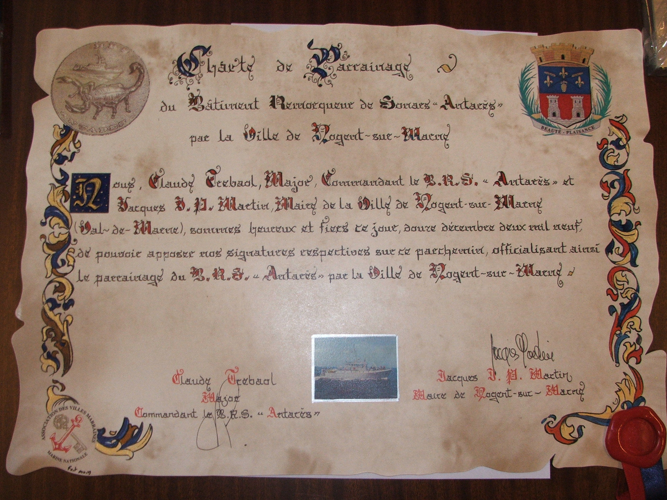 Le samedi 12 décembre, le commandant du BRS Antarès et le maire de Nogent sur Marne ont officiellement signé la charte de parrainage.
