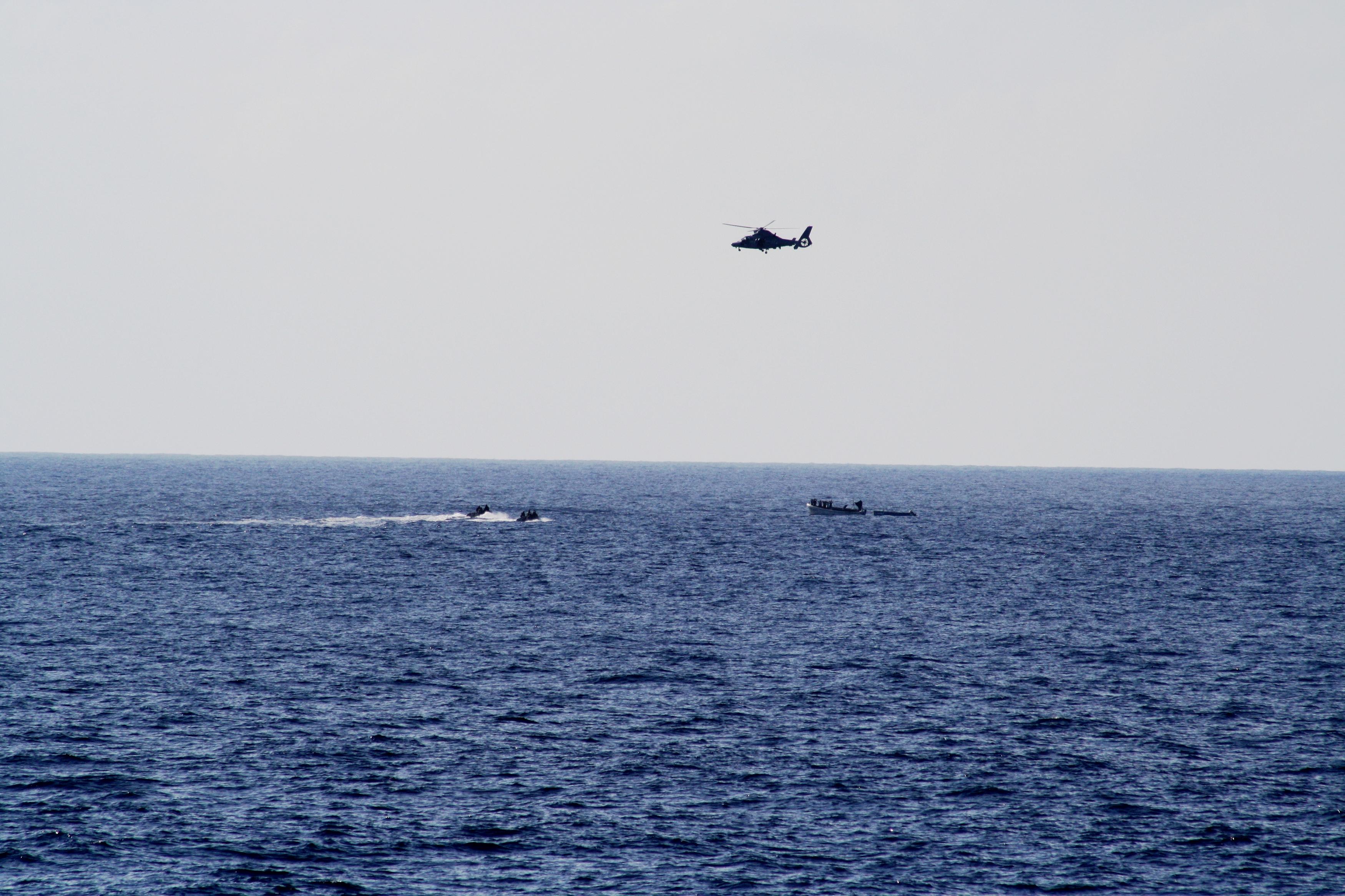 Le Nivôse a envoyé son hélicoptère et sa brigade de protection qui ont ensuite appréhendé 7 pirates présumés et découvert des armes de petit calibre, un lance-roquettes et des échelles.