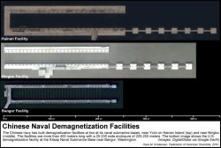 Les 2 installations chinoises de démagnétisation connues sont similaires, pouvant traiter toutes les tailles de sous-marins chinois, et d’une conception similaire aux installations américaines du même type.