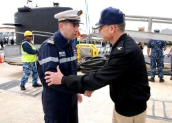 A l’arrivée à quai, le capitaine de frégate Christian Houette, commandant de la Perle, a été chaleureusement accueilli par le Capt. Chris Thomas, commandant du Submarine Squadron 6.
