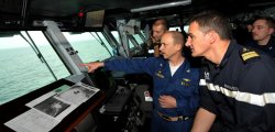 Le capitaine de vaisseau Gilles Boidevezi, commandant du Jean Bart, a passé une journée à bord du porte-avions USS Harry S. Truman. Le Capt. Joe Clarkson, commandant du porte-avions, lui a présenté certaines des particularités du pont d’envol.