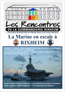Dans le cadre du rayonnement et du lien armée nation, l’Association des Réservistes de la Marine organise une exposition marine dans les locaux prestigieux de la commanderie de Rixheim du vendredi 1er octobre au jeudi 7 octobre 2010.