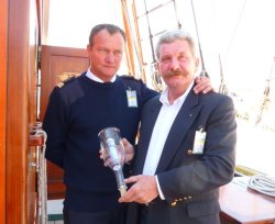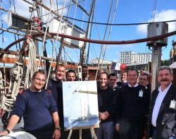 Lundi 27 septembre, Pierre-Arnaud Lebonnois, peintre portuaire, a remis au lieutenant de vaisseau Laurent, commandant de l’Etoile, sa toile intitulée "Une bouteille à la Mer".