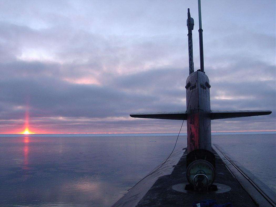 Le sous-marin d’attaque USS Honolulu (SSN 718) de la classe Los Angeles, fait surface dans une zone d’eau libre à environ 280 milles du pôle Nord.