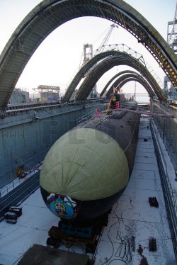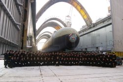 Elles ont été prises lors de la cérémonie de lancement, au chantier Sevmash. Pour la première fois, une image du sous-marin à flot est disponible.