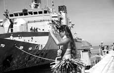 Arrivé hier matin à Nouméa, le Vendémiaire a été accueilli par un groupe de danseuses tahitiennes. Le bâtiment rentre de trois mois de mission. (photo les Nouvelles Calédoniennes).