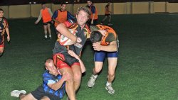 Le match s’est déroulé en 3 mi-temps — une tradition locale qui illustre bien les températures qui règnent sur place. Alignant une équipe plus jeune, mais peu expérimentée, le JRFC a néanmoins réussi à ouvrir le score avec un essai. Les matelots du Mistral se sont rapidement regroupés et sont entrés dans le jeu avec toute l’énergie à laquelle on pouvait s’attendre. Dès le début de la 1ère mi-temps, il était clair que le match serait une compétition entre le bon niveau de forme des Français et le poids de l’expérience de jouer ensemble pour Djeddah.
