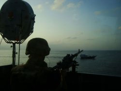 Au cours de sa patrouille, son hélicoptère a repéré une embarcation se dirigeant vers l’est. Les photographies prises ont montré qu’il s’agissait d’un boutre de pêche qui avait été capturé il y a plus d’un an par les pirates, et qui était soupçonné d’être utilisé comme bateau-mère par les pirates.
