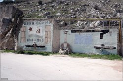 [NdT sur le panneau , il est écrit « Souviens-toi de la guerre 1941 - 1945. Flotte de mer Noire. La colonne rostrale est typique de Sébastopol. Le sous-marin ressemble fort à un Romeo. La médaille à droite rappelle l’Ordre du drapeau rouge décerné à cette flotte.]