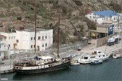 Bâtiment administratif. Schooner (?) au premier plan : ancien bâtiment de démagnétisation de la flotte de mer Noire.