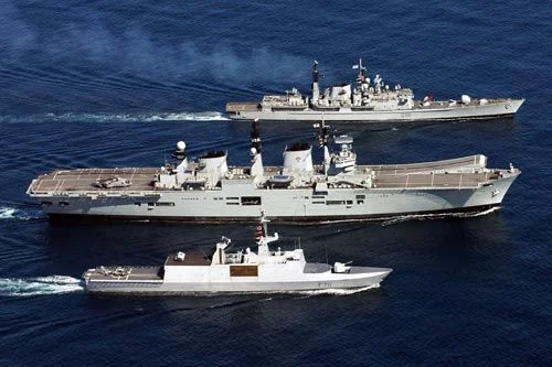 Le navire amiral de la flotte britannqiue, le HMS Illustrious, le Destroyer du Type 42 HMS Gloucester et la frégate française du type Lafayette, le Surcouf.