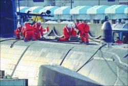 Des marins canadiens amarrent le HMCS Chicoutimi après son voyage transatlantique à bord d’un cargo en février 2005. (Archives)