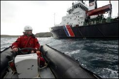 Un marin du remorqueur de haute-mer "Abeille-Flandre" pilote un canot pneumatique aux abords de l’île d’Ouessant . [© AFP]