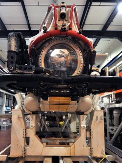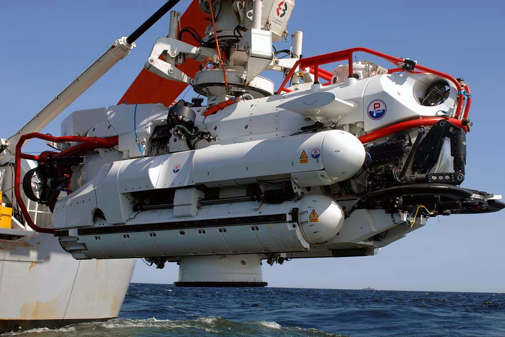 Toute la plateforme de chargement est boulonnée sur le pont du navire et le sous-marin — sorti tout droit d’un film de science-fiction avec sa bulle de verre à l’avant — est prêt à plonger, mis à l’eau par les grues qui font parti de l’ensemble.