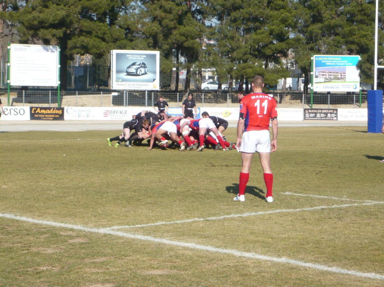 Sûrement, au vu du déroulement du match. Les jeunes Aixois ne se laissent pas faire et entament leur match. Nous les voyons se réorganiser et provoquer l’équipe marine en défiant la ligne des trois-quarts adverse. Les marins quant à eux ne semblent pas s’être vraiment trouvés et se cantonnent à défendre leur camp comme ils le peuvent. Et les fautes commencent à apparaître, entraînant pénalités et retraites dans leur 22 mètres. Les jeunes joueurs d’Aix en Provence en profitent et arrivent à trouver le décalage permettant de marquer leur premier essai transformé à la 24ème minute du match. Le match tourne maintenant à l’avantage des Aixois. La défense marine se faisant un peu approximative, les intervalles permettent aux locaux de se frayer un chemin vers l’en-but du RCMN et d’ajouter sept points au score quatre minutes après l’ouverture de leur compteur. Une agitation du côté du staff de la marine nationale se ressent, ça bouge sur le bord de la touche… Les marins reprennent la main sur le ballon toujours grâce à leurs bonnes mêlées qui les font avancer mais les lancements de jeu restent trop timides pour inquiéter les Espoirs du PARC et nos joueurs ne se sont visiblement pas libérés. Les marins trouvent des touches … qu’ils n’exploitent pas vraiment entre les ballons perdus sur les lancers et ceux mal joués à la sortie. Nous espérons, que ce n’est qu’un début difficile pour nos marins. En tout cas, c’est la mi-temps et l’heure pour les joueurs pour les coachs de s’expliquer…