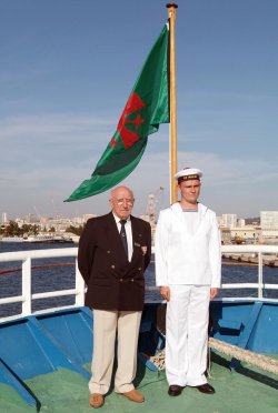 Un ancien du Malin pose avec un de ses successeurs devant le pavillon de beaupré aux couleurs de la croix de Guerre 39 - 45. Photo : Marine Nationale, tous droits réservés.