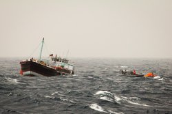 A la réception de l’appel de détresse, la frégate Surcouf de la marine nationale, qui patrouillait à 26 nautiques de là, s’est dirigé vers le dhow dont l’équipage, à cet instant, avait abandonné le navire par une mer agitée et embarqué sur le radeau de survie.