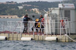 En surface, rien de très spectaculaire, bien au contraire. Seule une barge accueille les installations techniques nécessaires aux plongeurs : alimentation en air, surveillance vidéo et audio.