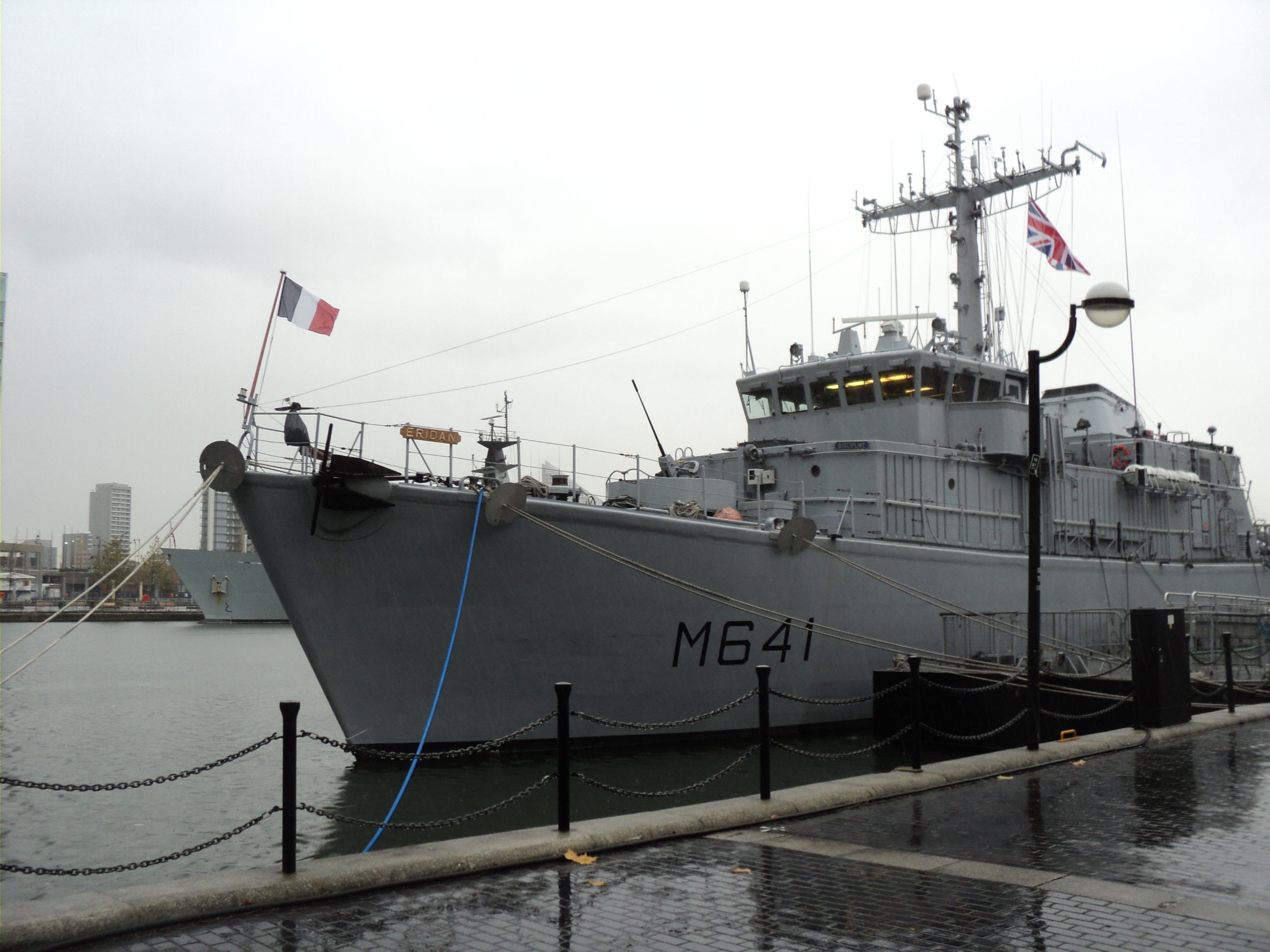 Le chasseur de mines Eridan est arrivé samedi 9 novembre à Londres. Il est accosté à West India Dock.