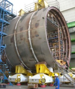 La construction du Terrible à Cherbourg est bien avancée. Toutes les sections de coque ont maintenant été assemblées à partir des anneaux pré-fabriqués et entièrement équipés. Elles sont alignées dans 2 halls d’assemblage parallèles. Les sections de coque sont installées sur des “marcheurs” contrôlés par ordinateur et alimentés hydrauliquement, chacun équipé de 4 “pieds” et d’un support central, qui peuvent manoeuvrer et déplacer les sections de coque. Au final, les “marcheurs” vont placer le sous-marin terminé sur un ascenceur qui va le descendre dans une cale sèche. Lorsque la cale sera inondée, le sous-marin flottera simplement, évitant le stress mécanique provoqué par un lancement traditionnel sur une pente graissée.