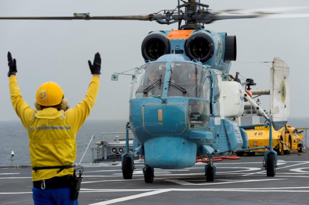 Le contre-amiral Bléjean est ensuite retourné à bord de son navire-amiral à bord de l’hélicoptère du Hetman Sagaidachny, un très impressionnant Ka-27 Helix. C’était la première folis qu’un tel hélicoptère appontait sur le Siroco.