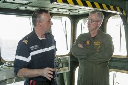 Pendant qu’il était à bord, l’amiral Sweeney a rencontré l’amiral Chaperon, l’état-major français et appris plus à propos des capacités des Rafale et des Super Etendard, la façon dont ils opèrent, sont lancés et récupérés.