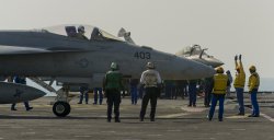Suite des échanges effectués dans le cadre de la mission Bois Belleau avec l’US Navy. C’est maintenant au tour d’un chasseur F-18 de se poser puis de décoller du pont du Charles de Gaulle.
