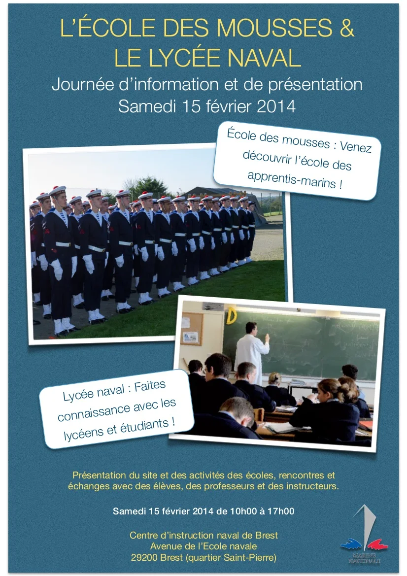 Une journée d’information et de présentation (JIP) du Lycée naval et de l’École des mousses se tiendra le samedi 15 février 2014 sur le site du Centre d’instruction naval de Brest, de 10h à 17h (dernière entrée sur le site).