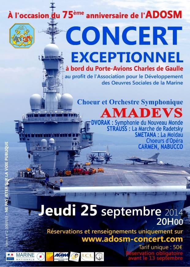 L’ADOSM fêtera son 75e anniversaire en musique ! Concert exceptionnel et grand public à bord du porte-avions Charles de Gaulle par le Chœur et orchestre symphonique AMADEVS, au profit de l’Association pour le développement des œuvres sociales de la Marine.