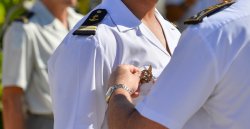 Un enseigne de vaisseau reçoit l’insigne de nageur de combat. Photo : L.Bouillon / Marine Nationale
